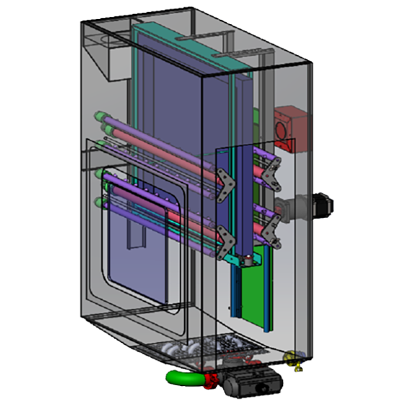 The machine uses a scientific nozzle design (patent pending), with eight spray arms distributed on both sides to effectively cover blind spots and ensure complete cleaning. The nozzles and spray arms are detachable for easy maintenance. The nozzle pressure is adjustable, solving issues of collision and splashing, especially for smaller workpieces under high-pressure conditions. The visual window and LED light system enhance the visualization of the entire cleaning process, making it easy for operators to monitor.